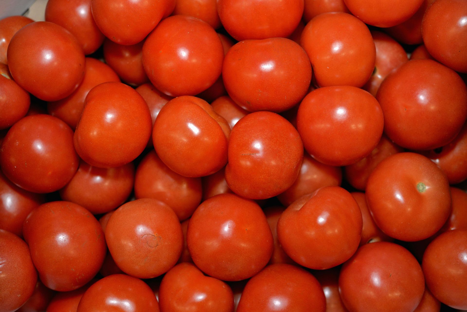 A pile of fresh red tomatoes in an overhead shot, perfect for food and culinary themes.