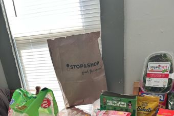 Delivering bags of food to children belonging to families selected to participate in the Food Assistance Program at Weaver High School, Hartford Connecticut.
